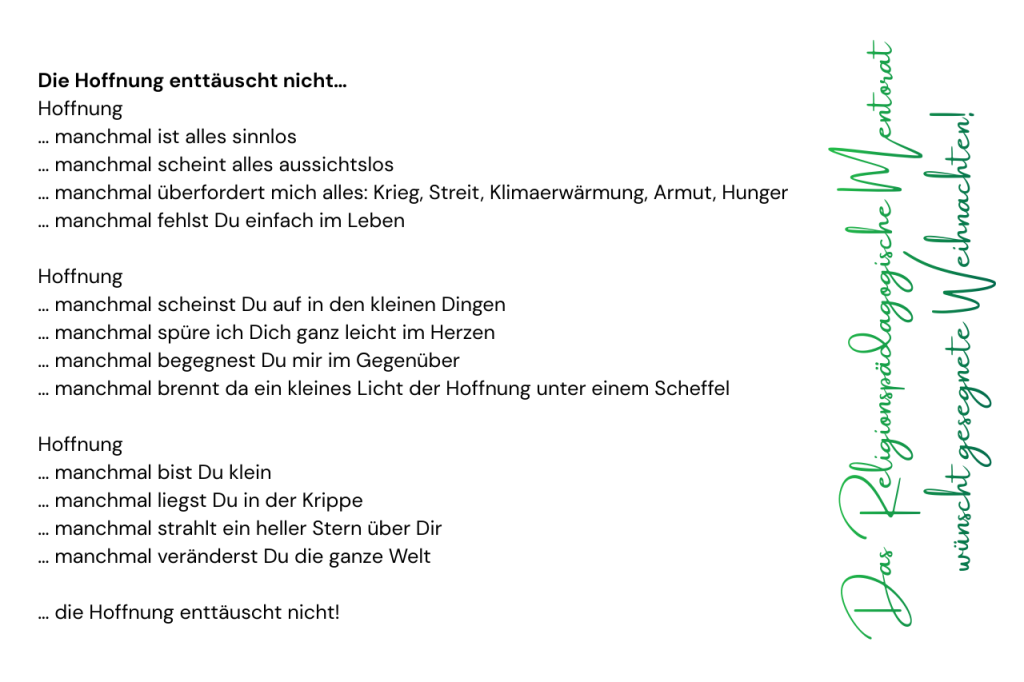 Das Religionspädagogische Mentorat ist eine Einrichtung der Diözese Rottenburg-Stuttgart zur Begleitung von Studierenden der Angewandten Theologie, der Religionspädagogik und der Praktischen Theologie. Sie finden Informationen über Studiengänge, unsere Angebote zur Studien- und Praxisbegleitung und den Bewerberkreis für Interessent/innen am Beruf Gemeindereferent/in.